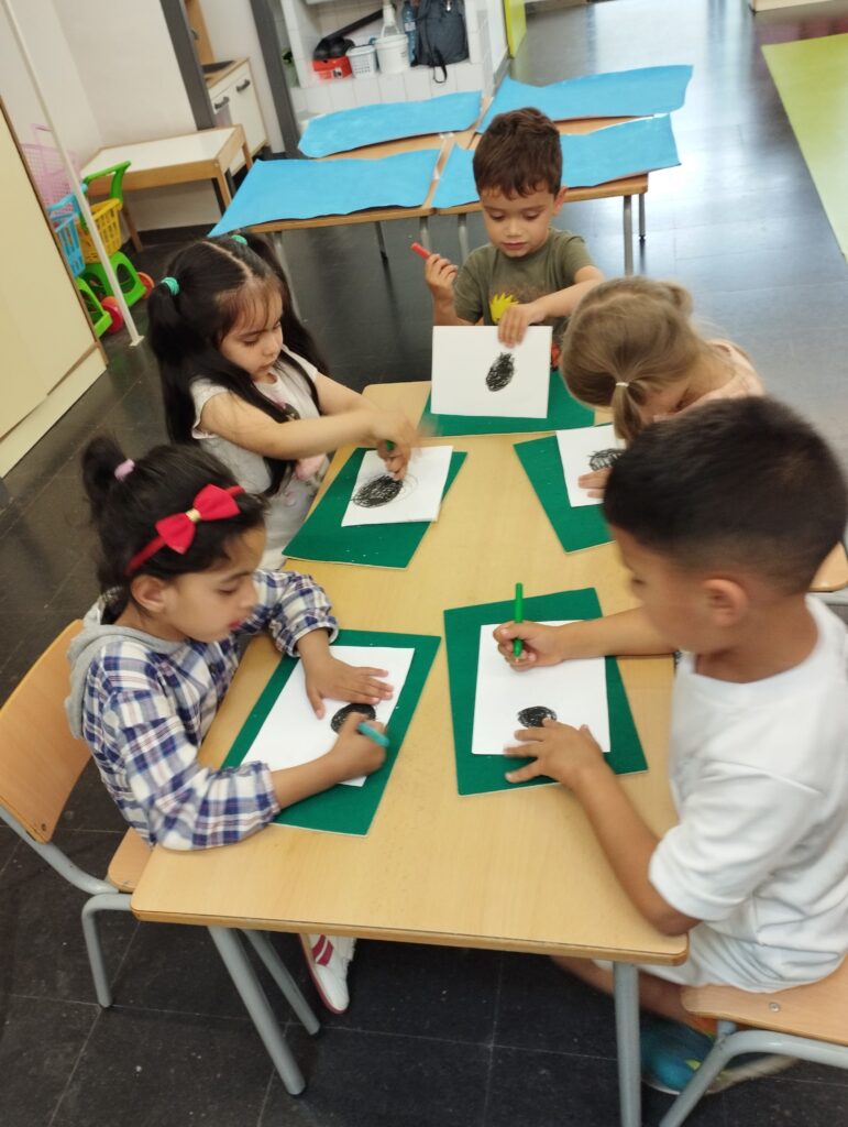 Una vegada pintat el fons fem la composició del quadre: cada infant de cada grup fa un punt pintat i punxat i una única línia amb paper de seda entre tot el grup.