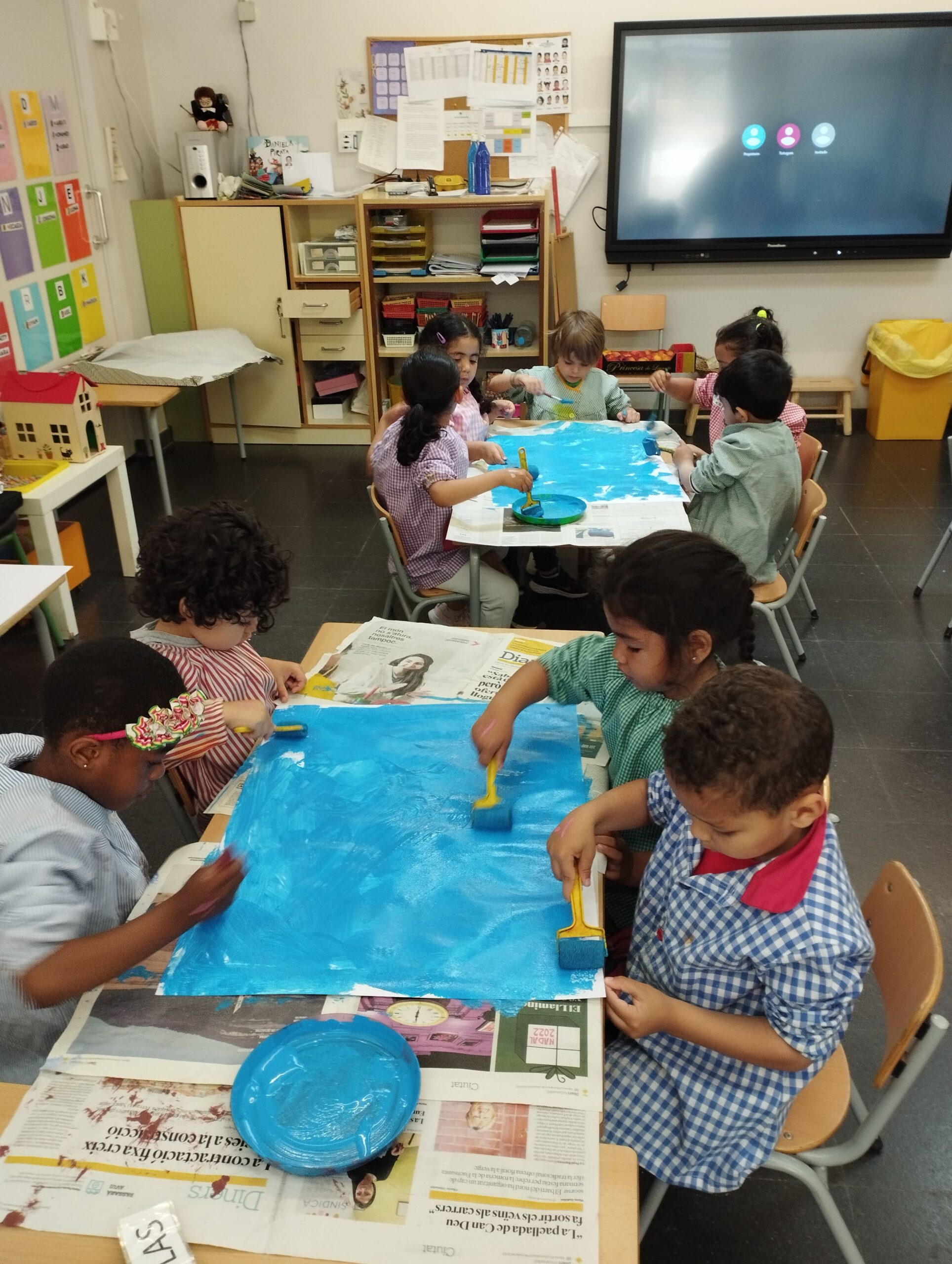 Després fem grups de treball i pintem el fons blau, un fons i quadre per grup.