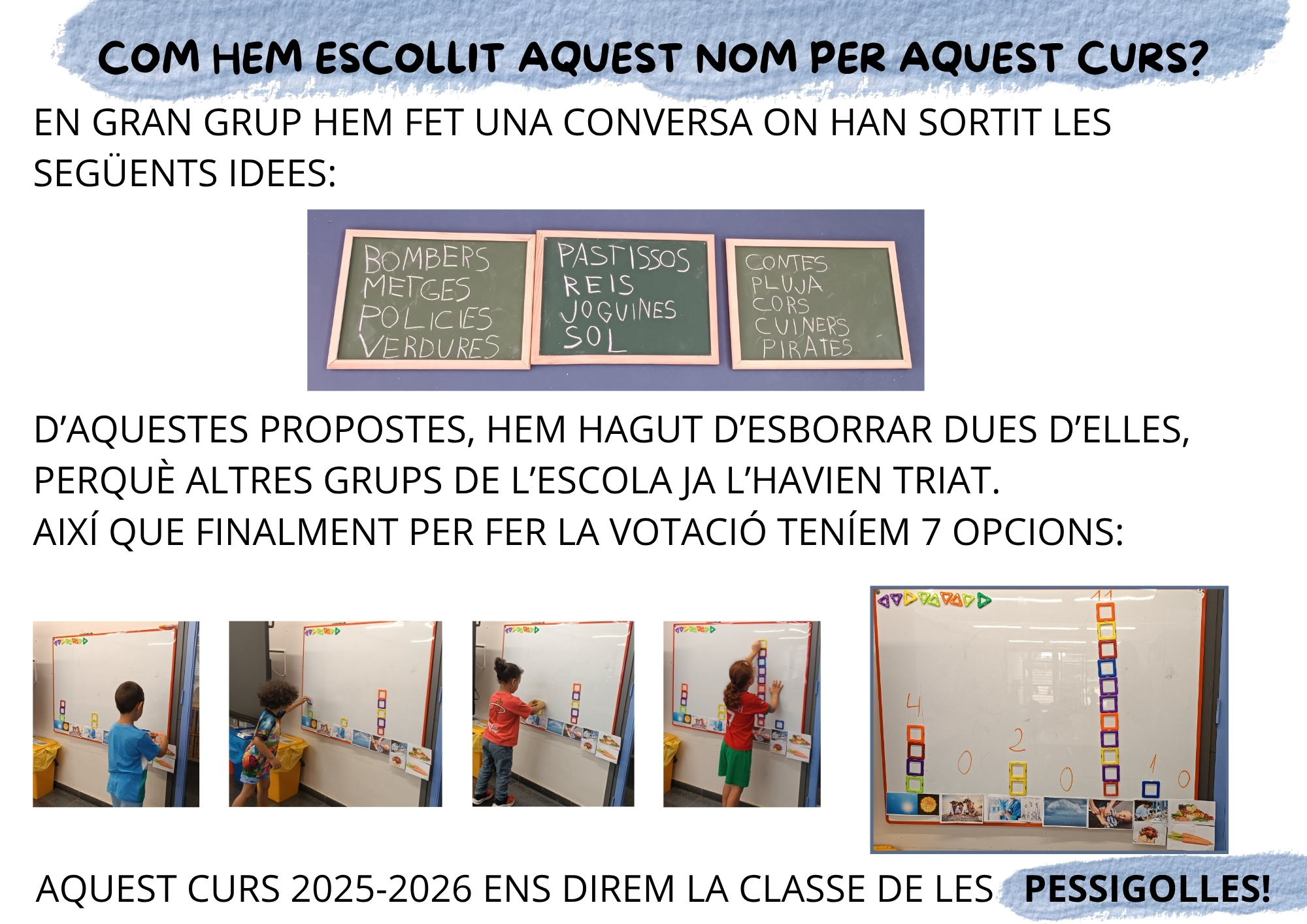 Classe de les PESSIGOLLES! Torreguitart01/10/25 Volem anunciar-vos que ja tenim nom per la nostra classe, per l’últim curs d’infantil! A banda de treballar les emocions, tenim molta curiositat per saber moltes coses del nostre cos! Som-hi amb el primer projecte del curs!