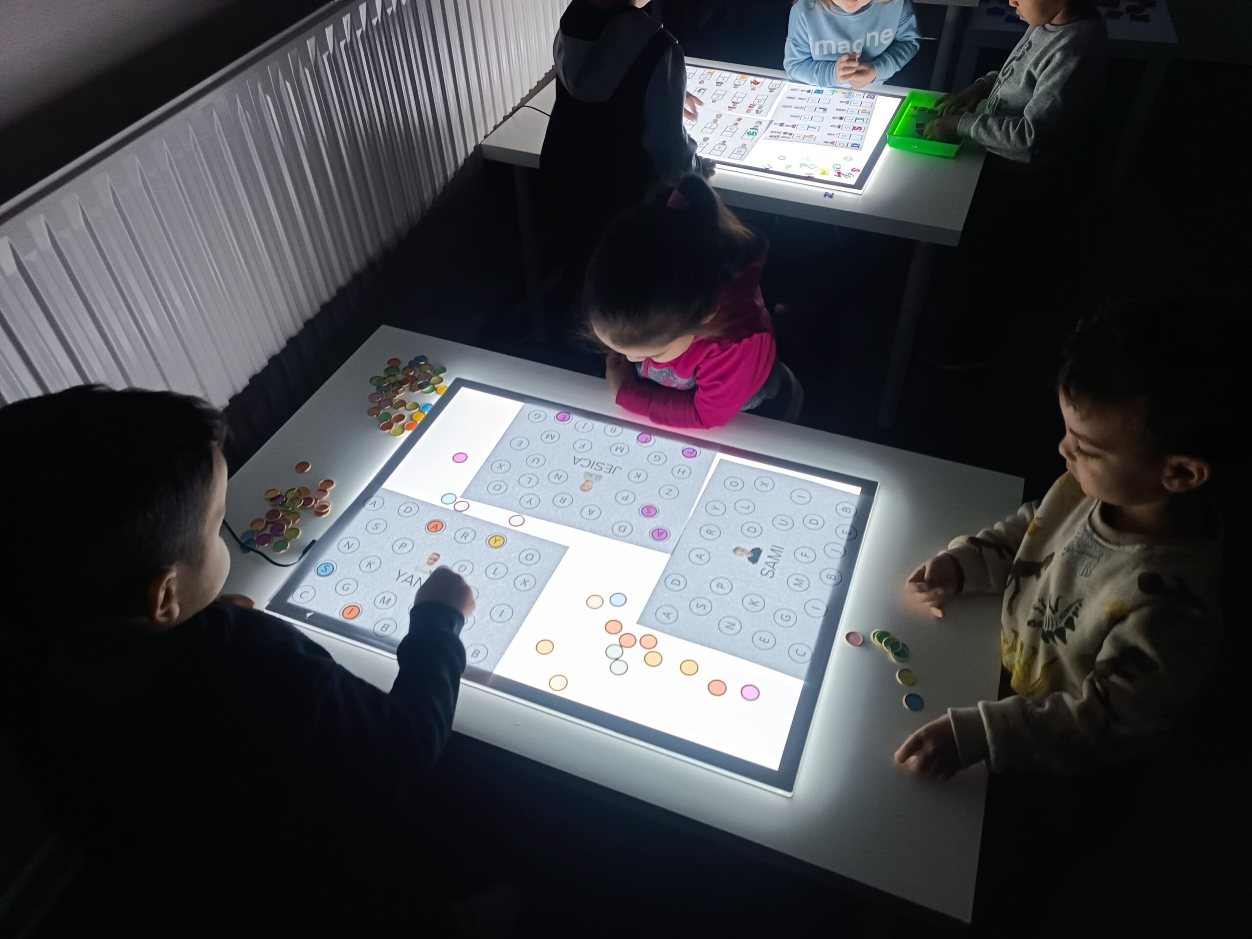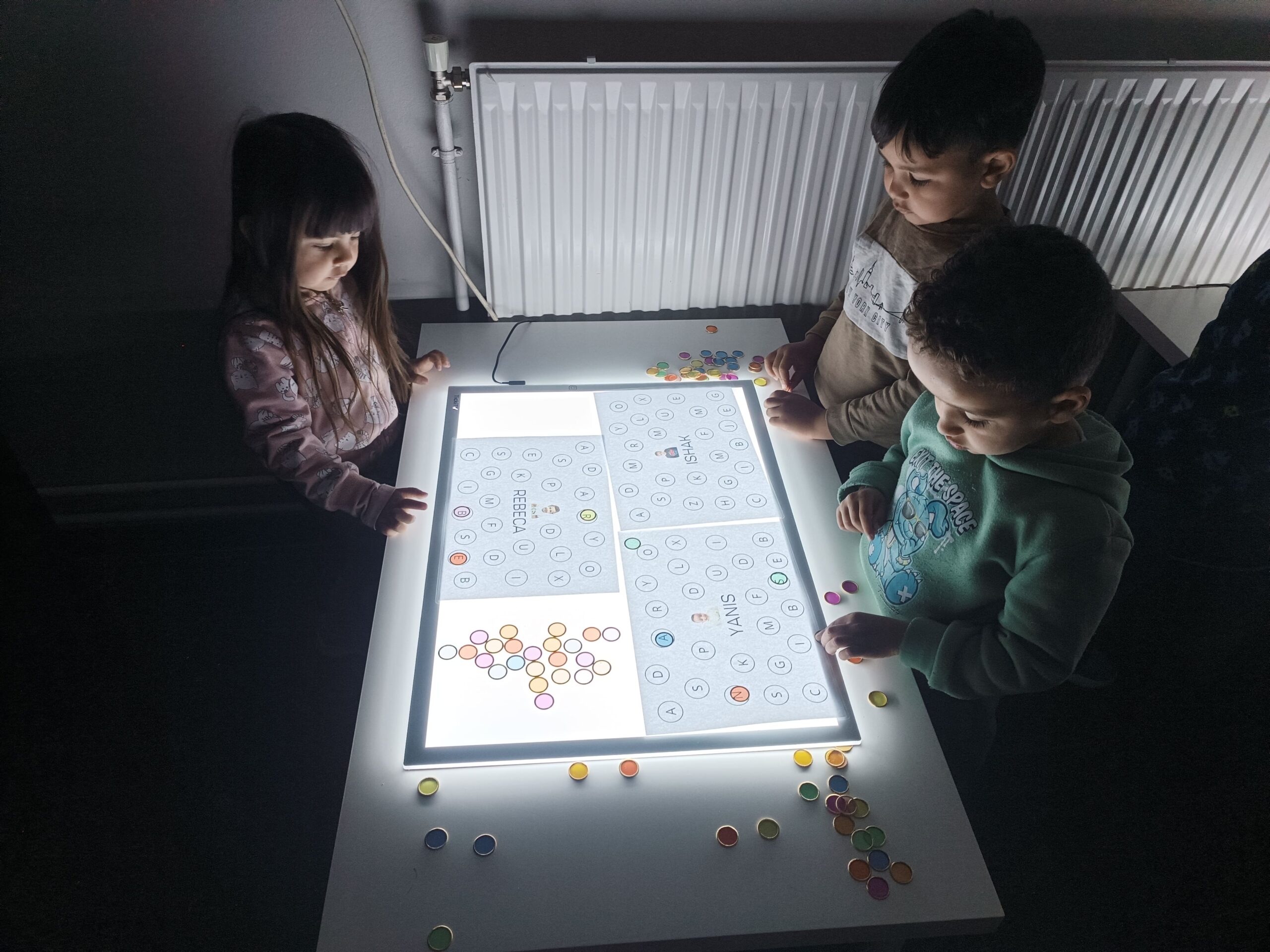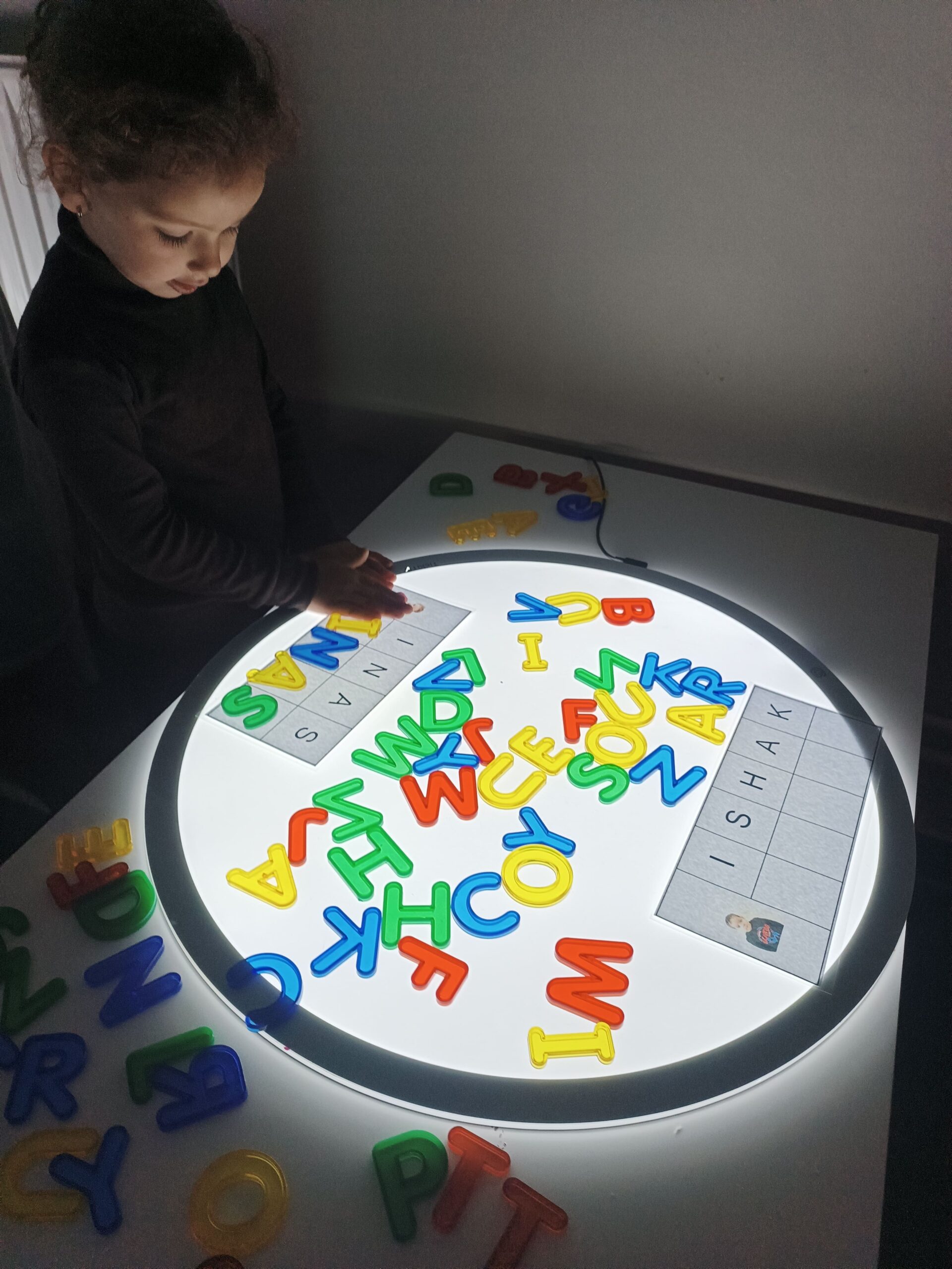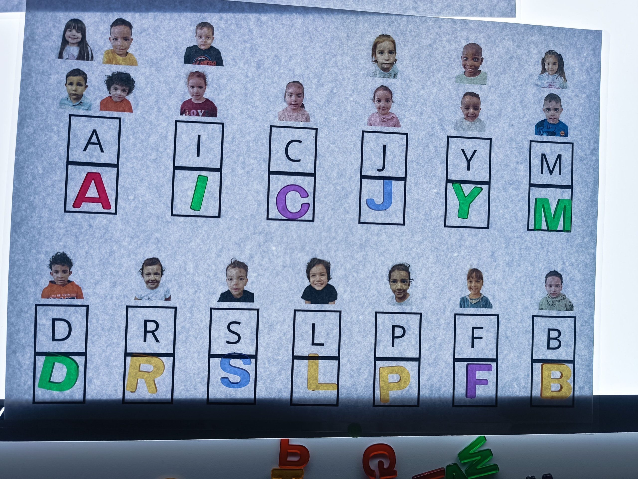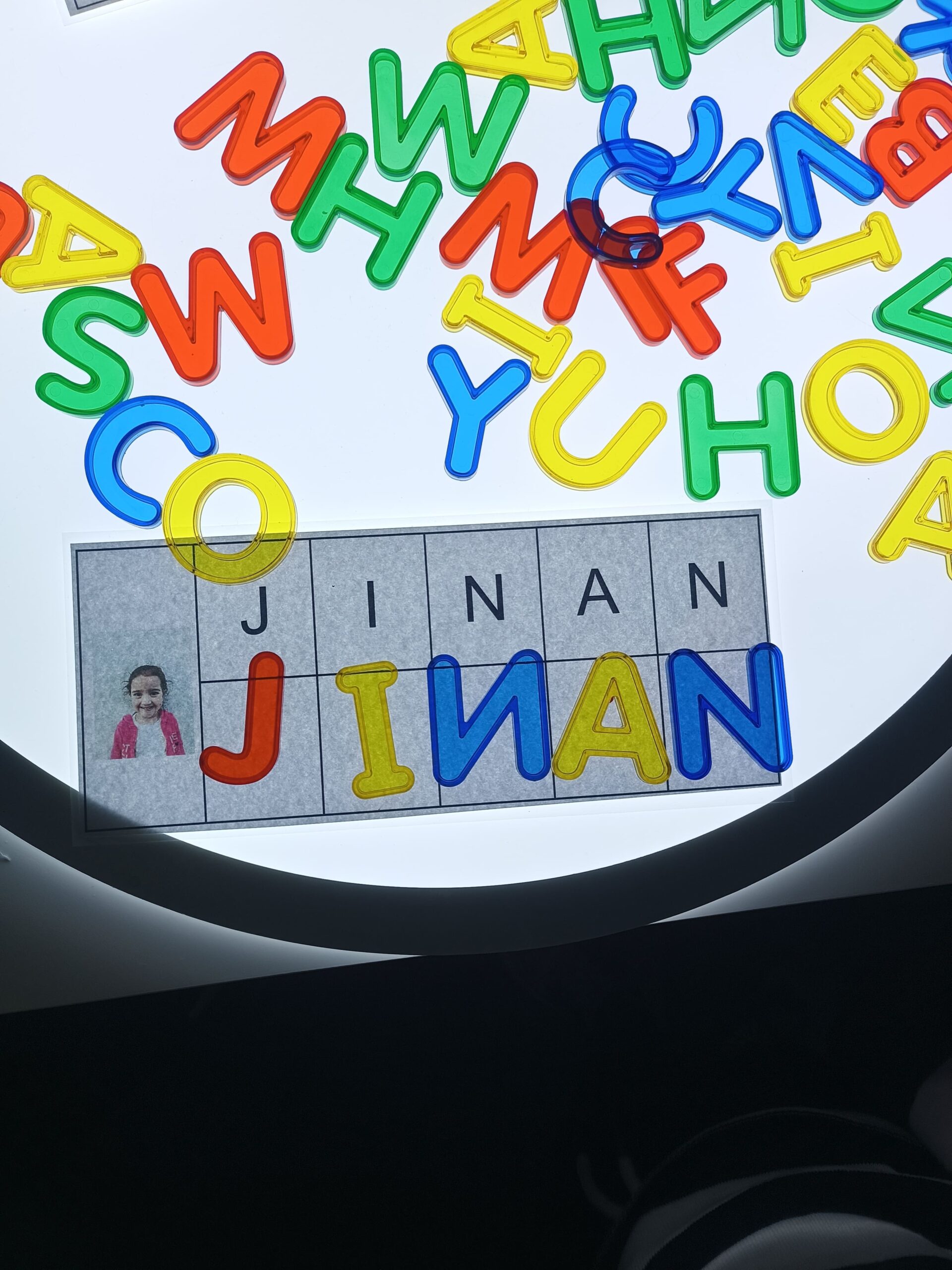 Aquesta vegada, hem anat a l’aula de llum i color en mig grup per manipular i jugar amb les lletres translúcides i els noms. Ens hem repartit en 3 taules amb diferents propostes relacionades entre elles. Aquí us deixem un recull de fotografies!