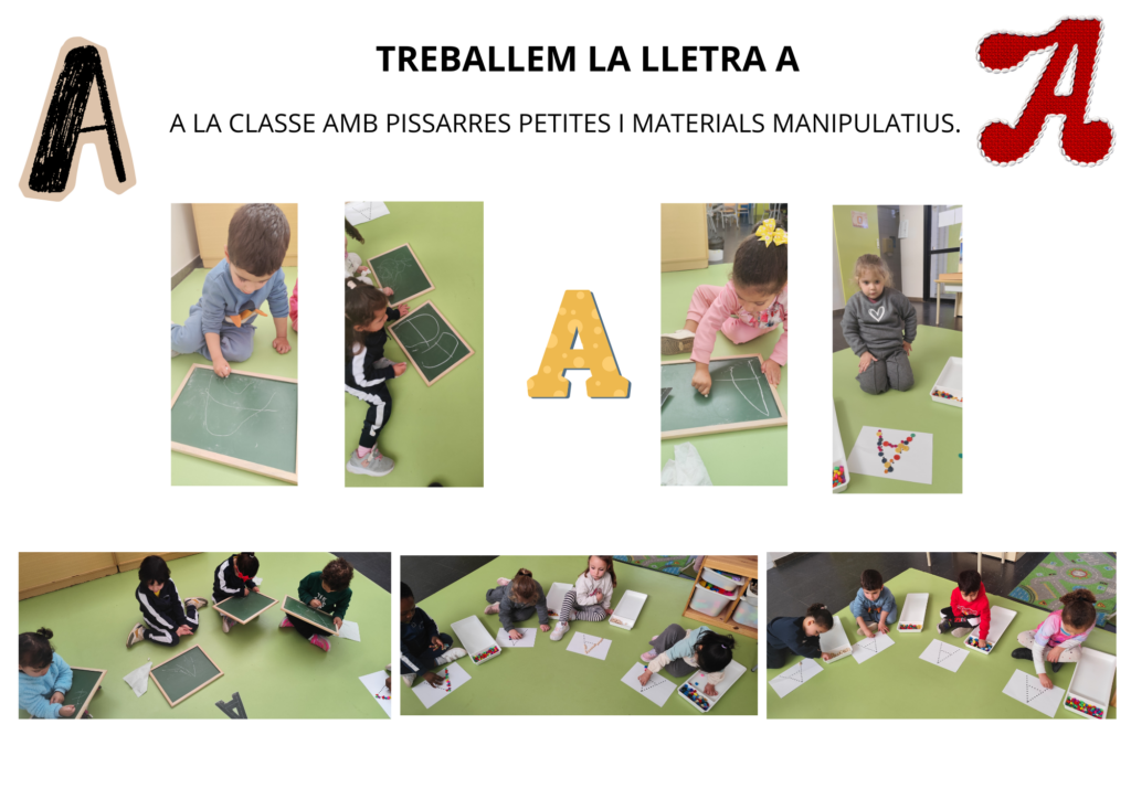 Aquestes últimes setmanes hem començat a treballar més profundament les lletres a l’aula. Hem iniciat aquest camí amb la lletra A, a través de propostes diverses i molt vivencials: la pantalla digital, les pissarres individuals, els guixos al pati i diferents materials manipulatius. D’aquesta manera, els infants poden experimentar, gaudir i aprendre d’una forma motivadora.