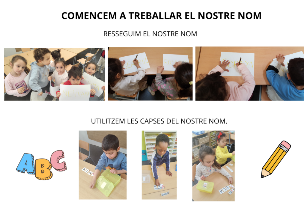 Paral·lelament, també estem treballant el nostre nom amb activitats com resseguir-lo, identificar quines lletres el formen i la capsa del nom, on cada infant busca les lletres del seu nom i les ha d’ordenar correctament. A poc a poc, anem avançant en el reconeixement de les lletres i en la descoberta del món de l’escriptura!