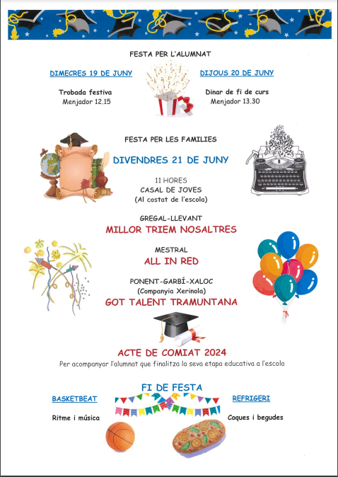 El curs ja s’acaba!!! Demà divendres farem la festa de fi curs on acomiadarem als companys i companyes que deixen l’escola per iniciar una nova etapa.