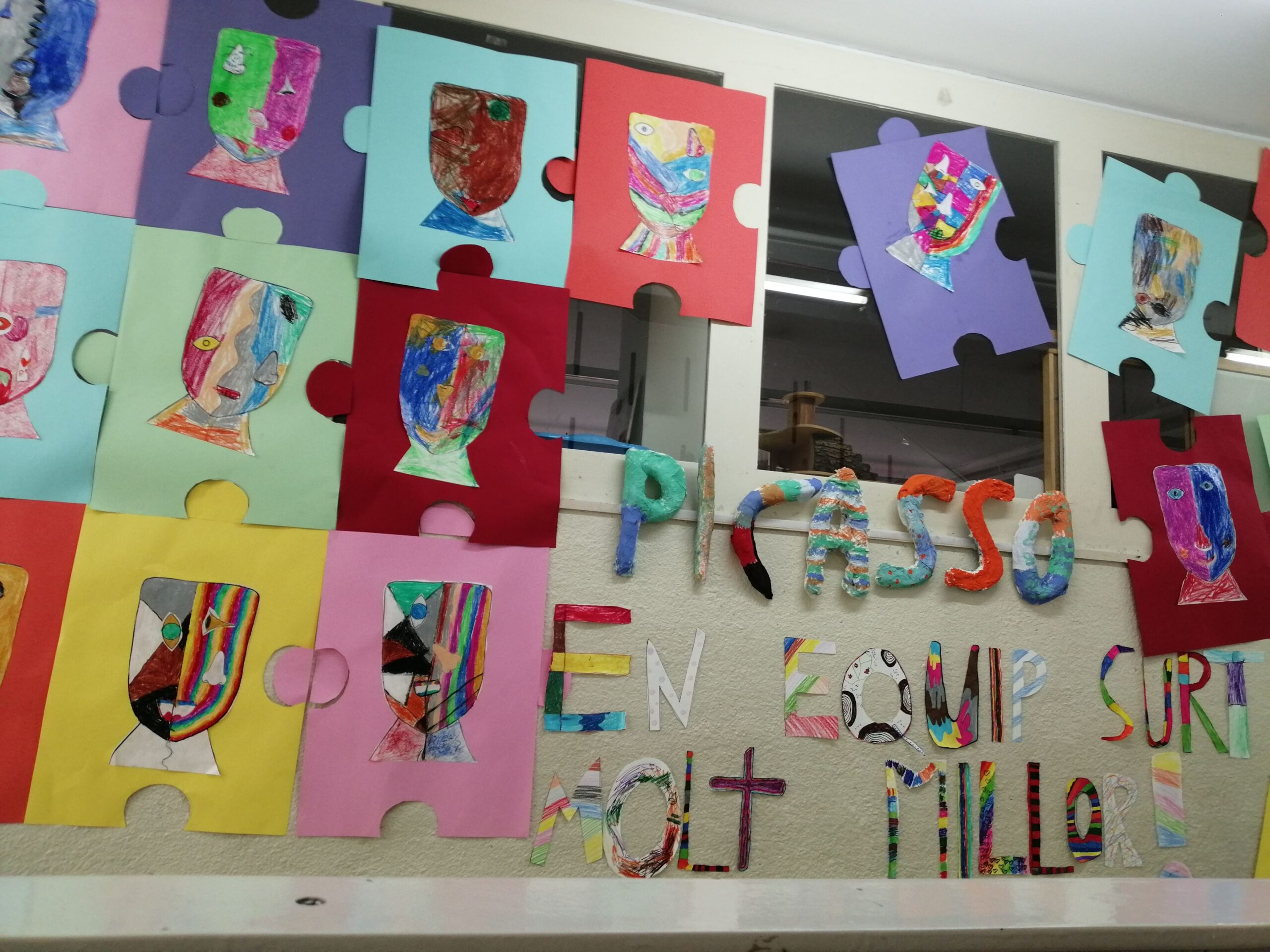Hola, som la classe de 2nB. En plàstica estem fent un taller de  Picasso. Primer vam veure un video i després vam pintar les cares a l’estil Picasso. Amb això vam fer un trencaclosques.