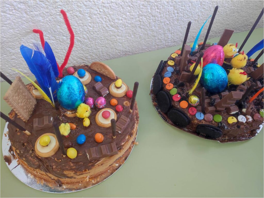 Per acomiadar el trimestre els nens i nenes de 3r i 4t hem fet la Mona. En grups hem decidit els ingredients que li volíem posar i ens hem divertit preparant-la. Però el millor de tot ha estat… menjar-la!
