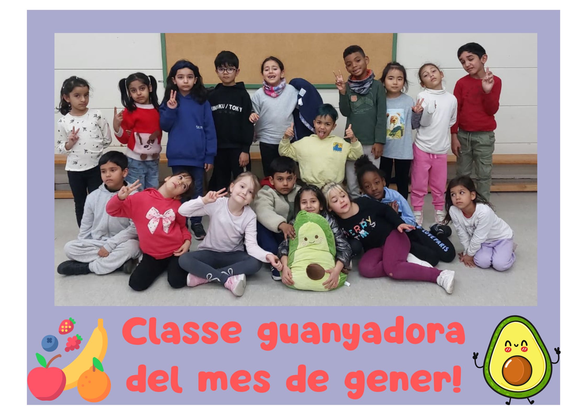 Des de l’àrea d’Educació Física hem impulsat el Rànquing saludable, una iniciativa per fomentar el consum de fruita a primària. Cada divendres es registren punts per grup i mensualment s’actualitza la classificació. Els guanyadors tenen l’honor de tenir a l’aula la mascota d’EF, un alvocat de peluix gegant. Enhorabona a 1r B, guanyadors del mes de gener!