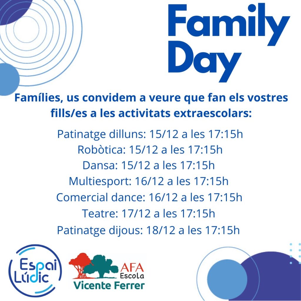 Recordeu que la propera setmana farem el Family Day (jornada de portes obertes a les activitats extraescolars).