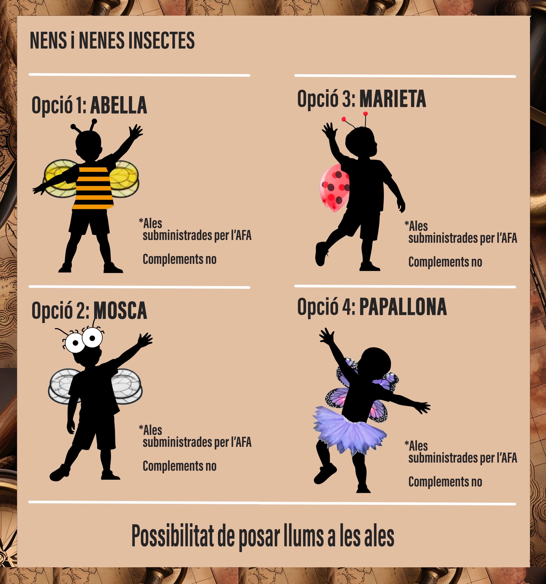 Durant les properes setmanes, l’AFA posarà a la vostra disposició part del material per a les disfresses, així com idees i inspiració per facilitar la creació dels vestits. (a la imatge s’especifica quina és la part que s’aporta des de l’AFA).
