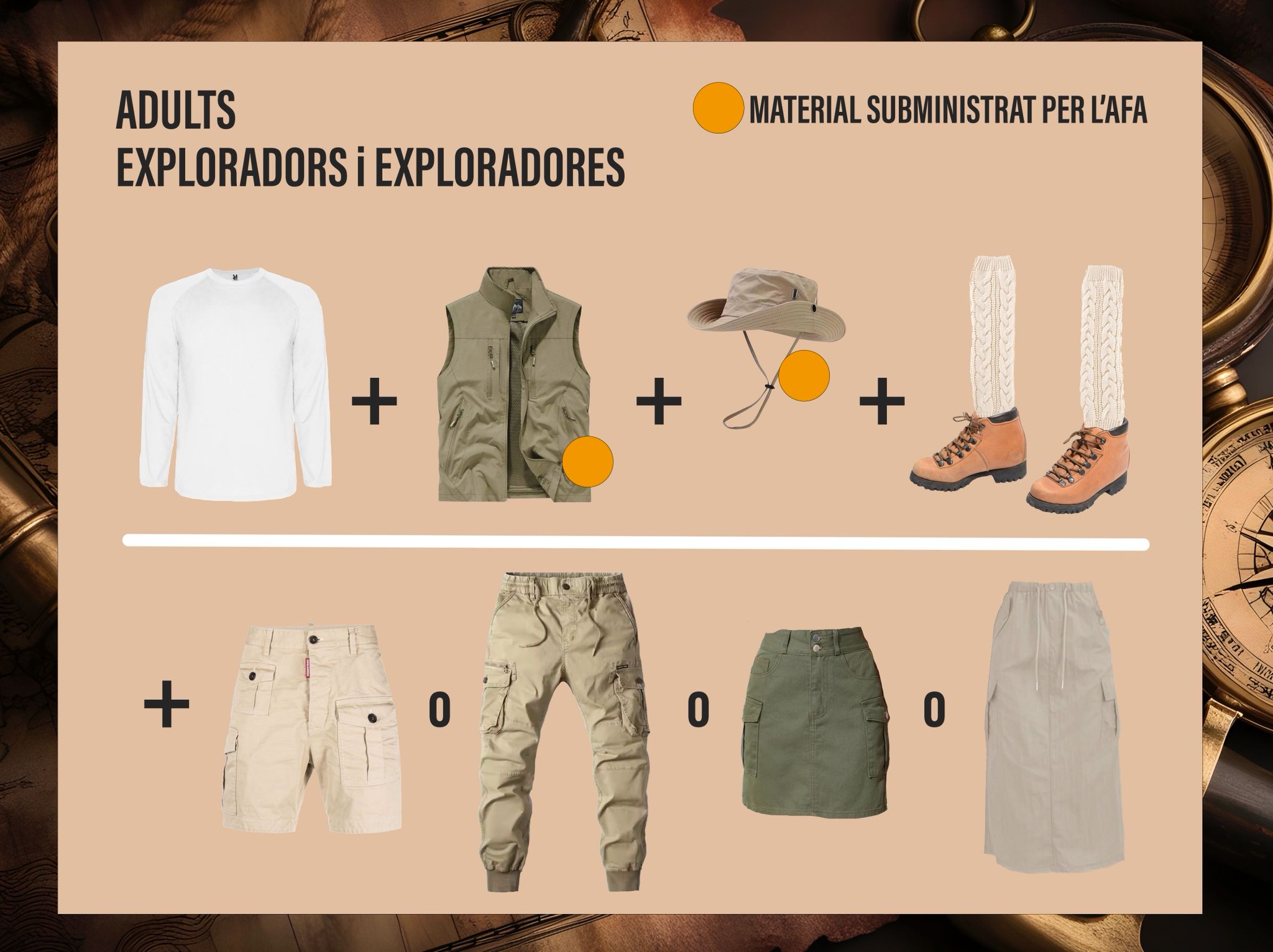 Durant les properes setmanes, l’AFA posarà a la vostra disposició part del material per a les disfresses, així com idees i inspiració per facilitar la creació dels vestits. (a la imatge s’especifica quina és la part que s’aporta des de l’AFA).