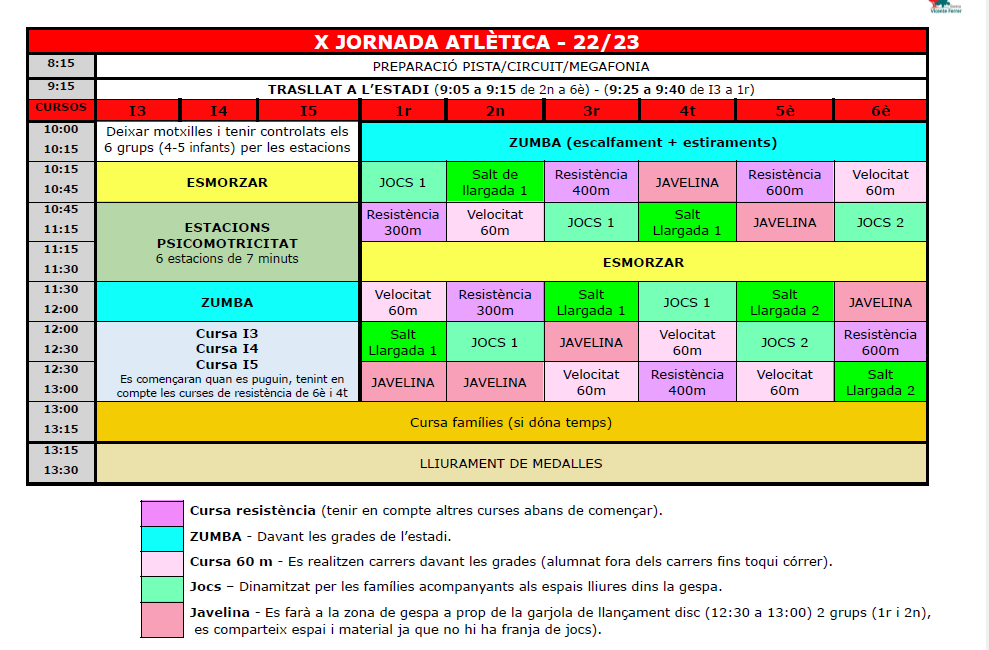 Demà, divendres 5 de maig, tindrem les nostres X Jornades Atlètiques a l’Estadi Municipal d’Atletisme Constantí Miranda. Ens podeu acompanyar de públic i animar als vostres fills/es en les seves proves. Acabarem la nostra jornada al voltant de les 13:30 h.