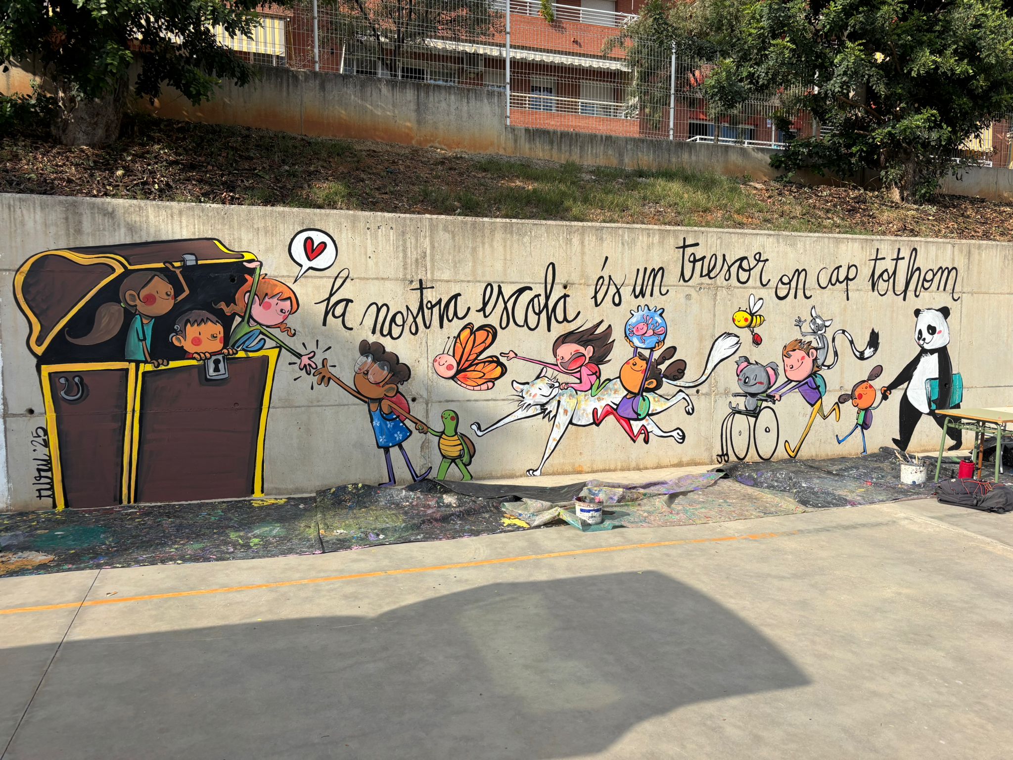 Com haureu pogut veure, el nostre alumnat de cicle superior ha participat en un taller i han elaborat un mural al pati de primària, amb l’acompanyament de l’il·lustrador Joan Turu.