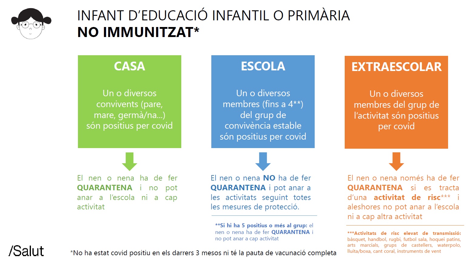 - Alumnes no immunitzats fan quarantena sempre que hi hagi un positiu a casa i quan hi hagi 5 o més al seu grup-classe.