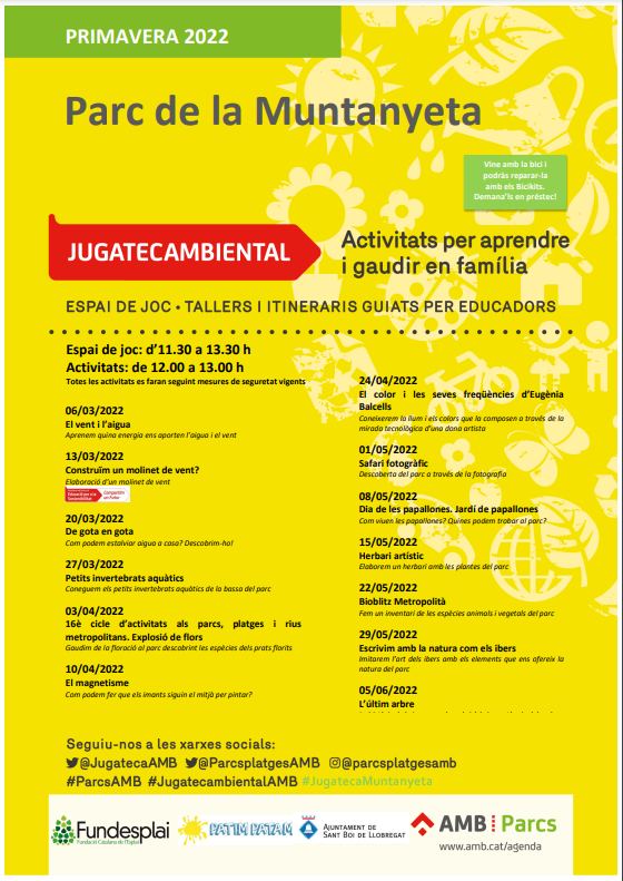 La jugatecambiental és un espai familiar que es desenvolupa conjuntament entre AMB i Ajuntament, amb l’objectiu de promoure els valors dels parcs metropolitans, en el nostre cas del Parc de la Muntanyeta. Té un espai de joc i experimentació no dirigit, un punt d’informació i una programació d’activitats dirigides de contingut mediambiental i de coneixement del parc.