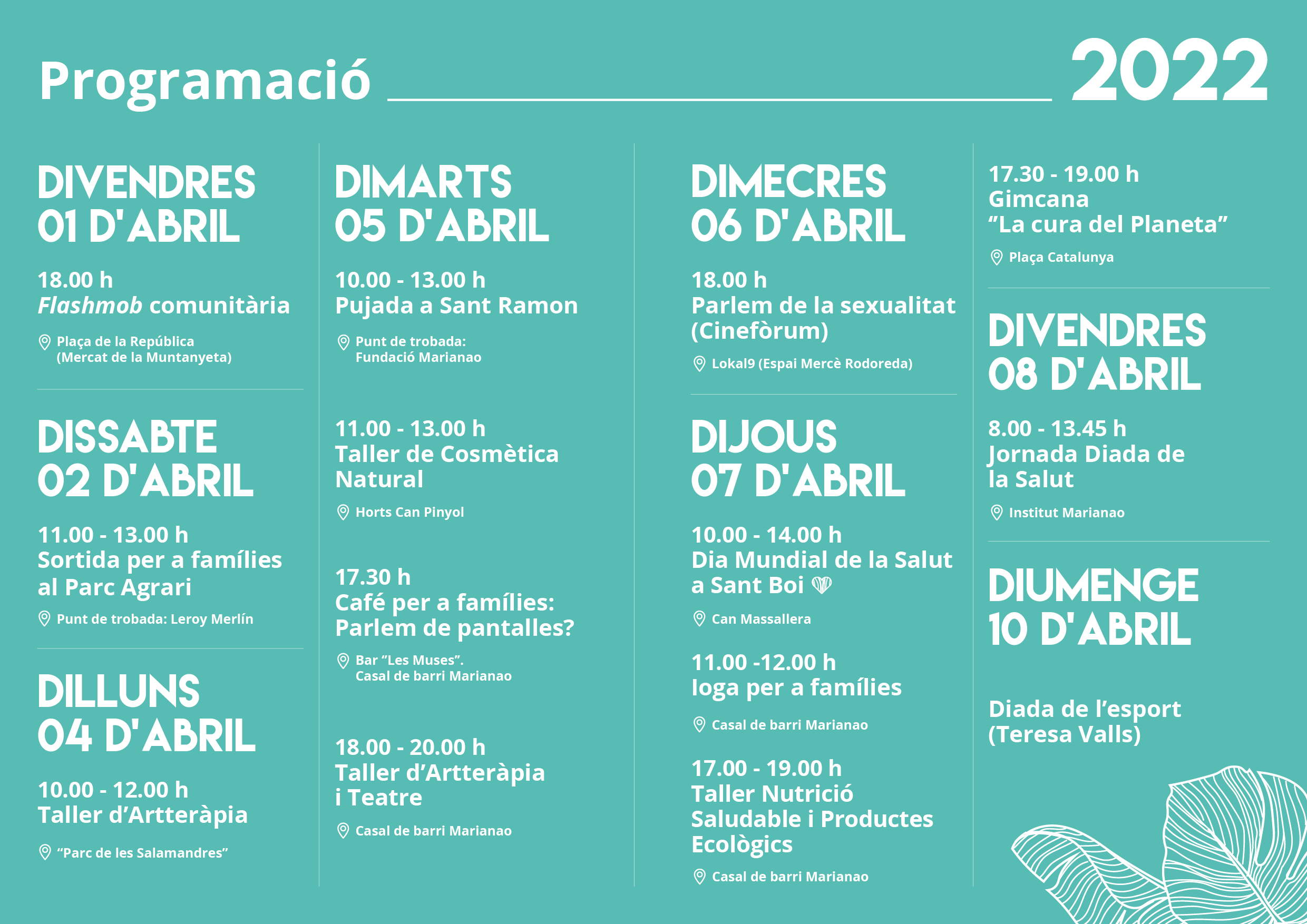Us adjuntem la programació de la Setmana de la Salut 2022, on podeu trobar tota la informació dels diferents horaris, llocs i activitats que portarem a terme.