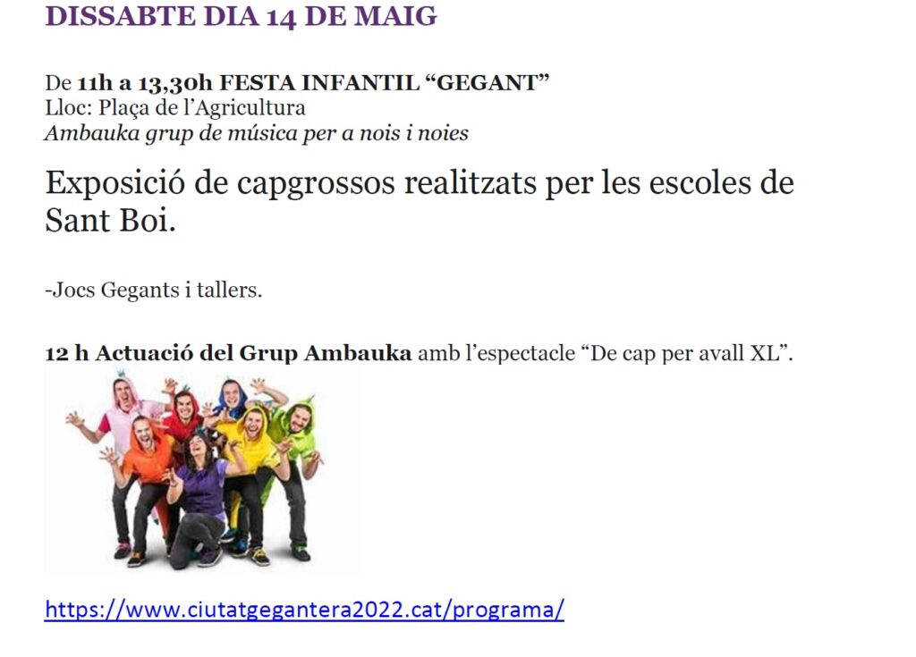 Els dies 13, 14 i 15 maig tenim un esdeveniment històric i únic a Sant Boi. La Vila serà proclamada Ciutat Gegantera, això vol dir que Sant Boi acollirà els Gegants de Catalunya durant tot un any. Tindrem més de 200 figures del món geganter a la nostra vila.