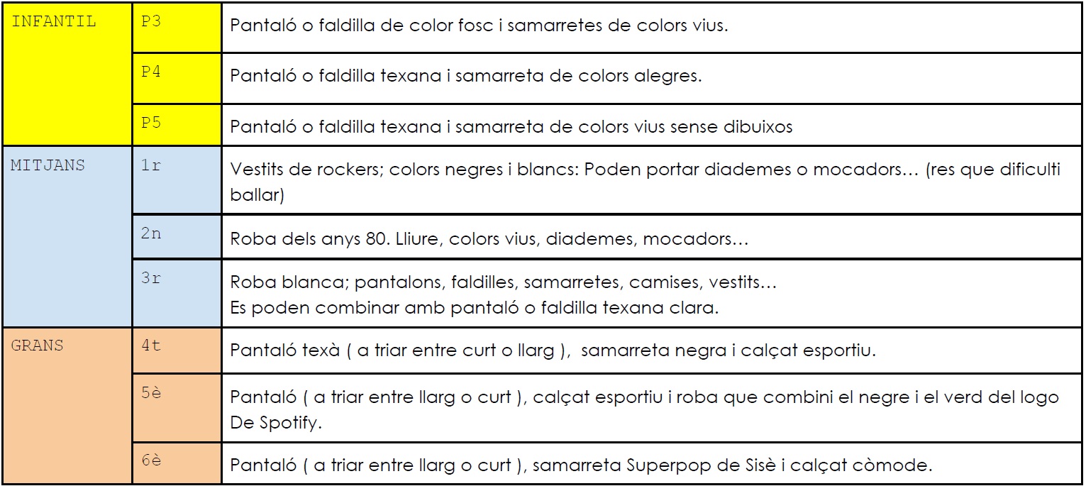 Els grups de primà ria acabaran cap a les 13 h i passarem una autorització per saber si tornaran a l’escola amb l’autocar o marxaran amb les famÃlies.