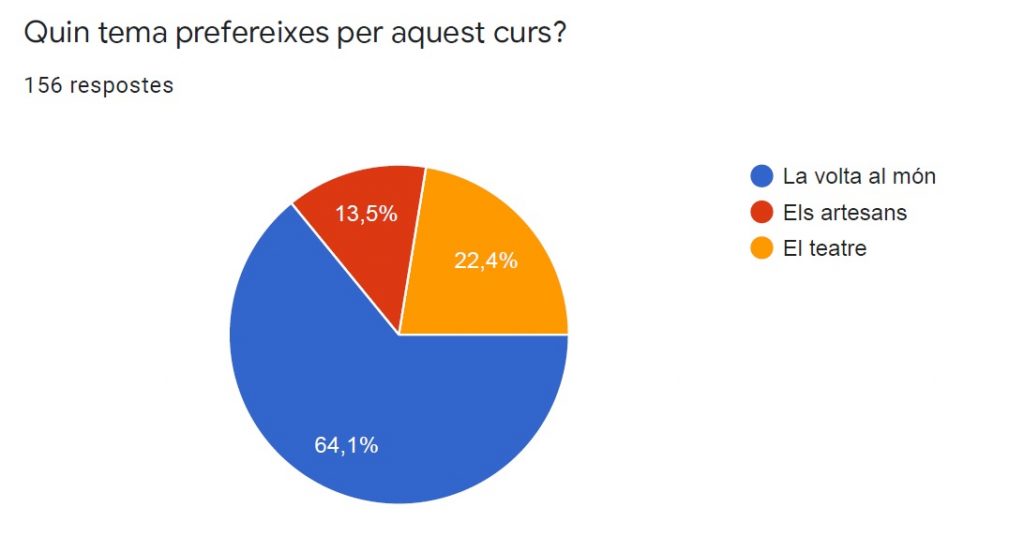 Eix temàtic: La volta al món Feu un comentari / Per Equip directiu / 7 de setembre de 2020 / Portada L’eix temàtic escollit per aquest curs ha estat la volta al món. Us posem el gràfic de les votacions. Veiem que han participat 156 alumnes dels 202 possibles (sense comptar P3), és a dir un 78% de participació.