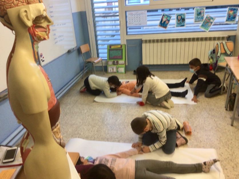 Per altra banda, estem plasmant aquests nous coneixements en un mural, on cada grup de treball hi participa dibuixant els òrgans i les parts del cos que estem treballant. A les classes de ‘Science’ també hi assisteix un maniquí que ens ajuda a conèixer millor el cos i a fer aquesta activitat. És molt interessant!