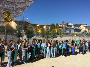 Una veu en off que no coneixíem ens va fer dirigir al pati a les 15:00. Quin misteri, no sabíem què passaria… Tota l’escola asseguts al pati vam anar fent suposicions de què podia arribar a passar, recordant les pistes del divendres i fent hipòtesis sobre quin podia ser el tema del curs. Finalment, va començar a entrar una riuada de gent vestida amb tons de blau i es van aparèixer uns globus de lletres, on vam poder llegir somRIU.