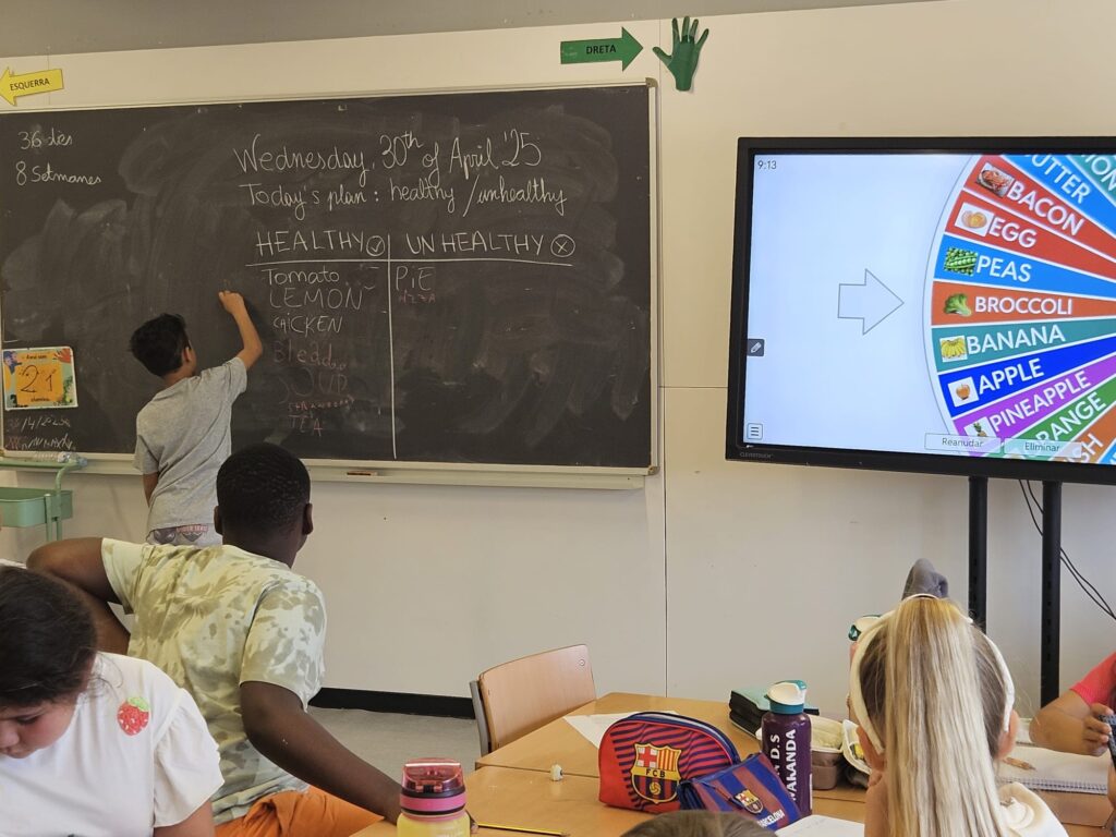 In Third grade, we are introducing the food pyramid. In this activity, they are classifying foods in healthy food and in unhealthy food using a roulette. They are reading, thinking and writing without even noticing them
