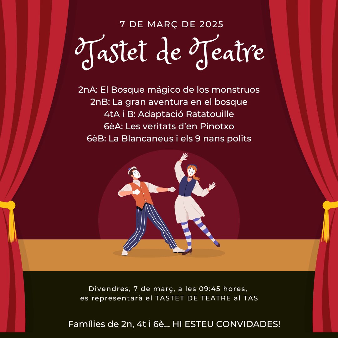 🎭 Tastet de Teatre!🎭 Feu un comentari / Per Escola Vora Mar / 28/02/2025 / General Portada 📅 Data: 7 de març🕕 Hora: 9:45📍 LLoc: TAS Salou Una oportunitat perfecta per passar una estona divertida, explorar la creativitat i deixar volar la imaginació! 🚀🎭😊