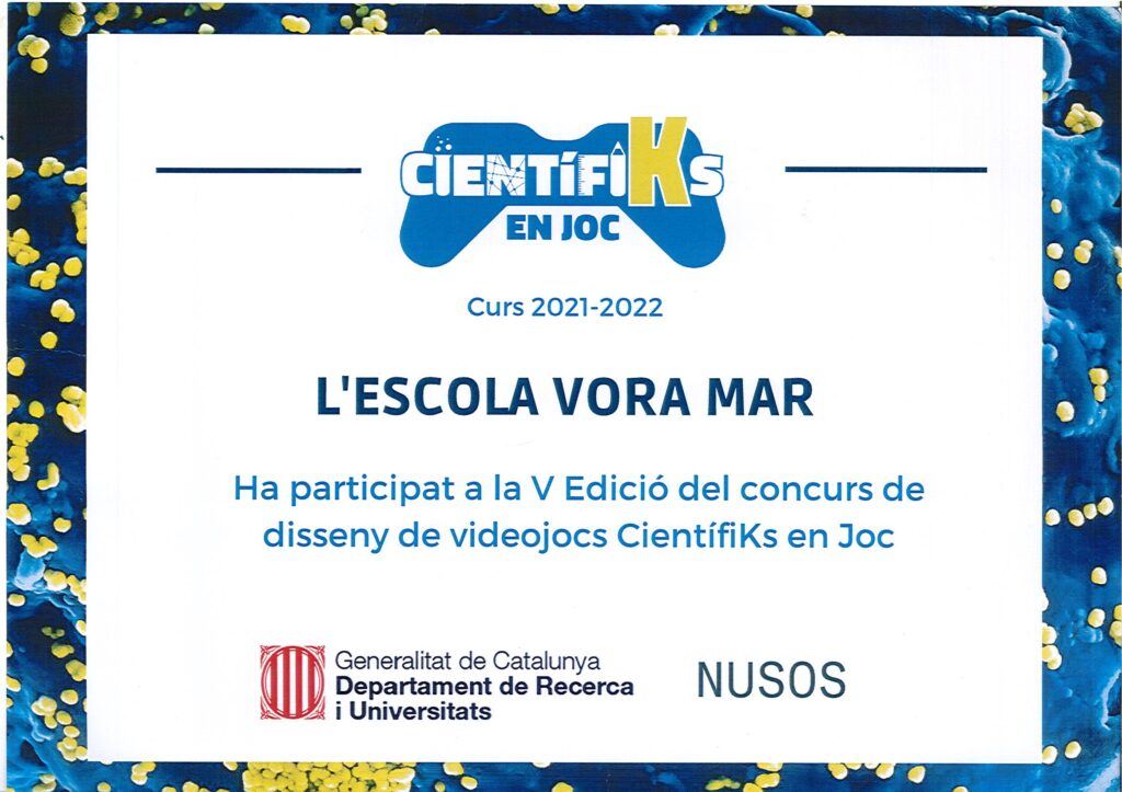 L’Escola Vora Mar ha participat el el concurs de disseny de videojocs CientífiKs en joc que és un programa educatiu virtual del Departament de Recerca i Universitats de la Generalitat de Catalunya adreçat a l’alumnat de 5è de primària de les escoles de Catalunya. Durant el curs hem dissenyat un videojoc sobre la Neus Rosell, una investigadora catalana, tractant l’Emergència Climàtica des de diverses perspectives de la recerca, de la mà de la nostra investigadora.