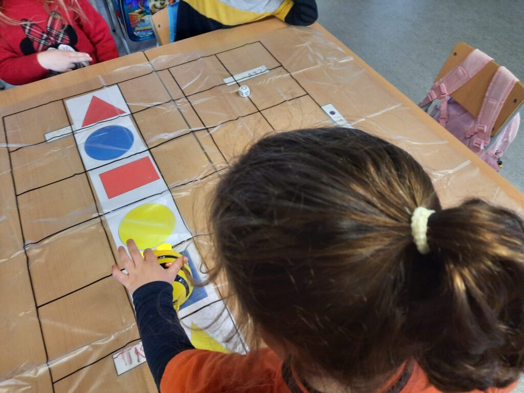 Utilitzem la Bee-bot per fer matemàtiques i treballem formes i colors alhora que establim relacions lògiques, ens situem en l’espai i comptem. Gaudim de noves experiències TAC. Ens ha agradat molt introduir-nos i aprofundir en l’apassionant món de la Robòtica.