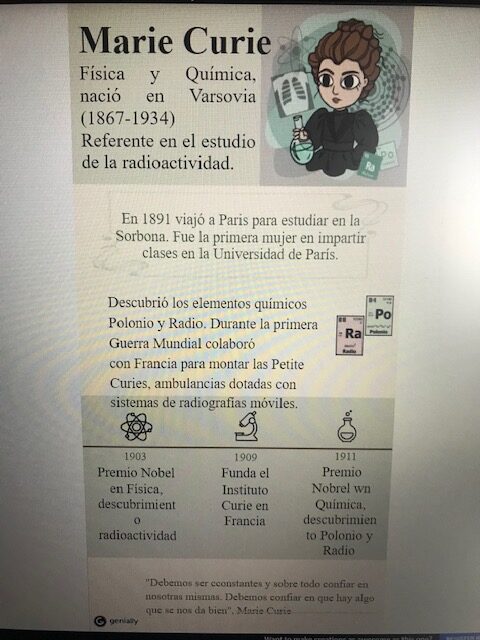Benvolgudes famílies, com sabeu, estem celebrant la Setmana Cultural i hem de dir que ho estem gaudint molt, perquè a més a més, el tema escollit ha estat «LA DONA», tema important i actual… A sisè C estem treballant una dona científica i molt especial, la MARIE CURIE. Us volíem fer cinc cèntims, aquí teniu aquesta imatge, per poder conèixer-la una mica més!! La Marie Curie va ser un punt d’inflexió al món de la química, afegint dos nous elements químics i consolidant l’estructura de l’àtom, tan decisiu per desenvolupar la radiologia i la radioactivitat. A classe, 6èC, hem construït la nostra química taula periòdica, però hem trobat una taula molt especial: LA TAULA DE LES EMOCIONS i la volíem compartir amb tots vosaltres… És molt especial, mireu-la!!