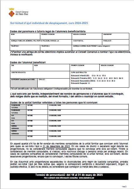 Les sol·licituds es podran presentar via telemàtica o presencialment al Consell Comarcal del Baix Ebre, a partir de demà 18 de març fins el dia 31 de març de 2025. Per fer el tràmit telemàticament, caldrà descarregar-se la sol·licitud, emplenar-la i escanejar-la. Dirigir-se a l’adreça https://baixebre.eadministracio.cat/ i a l’apartat instància genèrica. Una vegada s’hi hagi accedit, caldrà identificar-se electrònicament (amb certificat digital o donant-se d’alta a idCAT mòbil), i adjuntar la sol·licitud d’ajut de desplaçament degudament emplenada i signada escanejada juntament amb la documentació annexa, si s’escau.