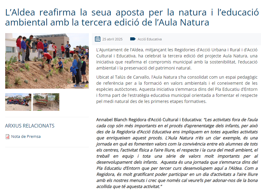 Us deixem els enllaços de l’Ajuntament de l’Aldea i alguns mitjans, amb els articles, les imatges i el vídeo on s’il·lustra l’activitat duta a terme el divendres 25 d’abril