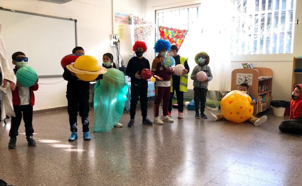 Aquest segon trimestre han vingut uns monitors a les aules de primer A i primer B a fer-nos uns tallers molt divertits relacionats amb els temes que estem treballant. 1- Taller del sistema Solar (1rA i 1rB) : Els nens i nenes hem representat, amb disfresses i materials, el Sol i els planetes, també els