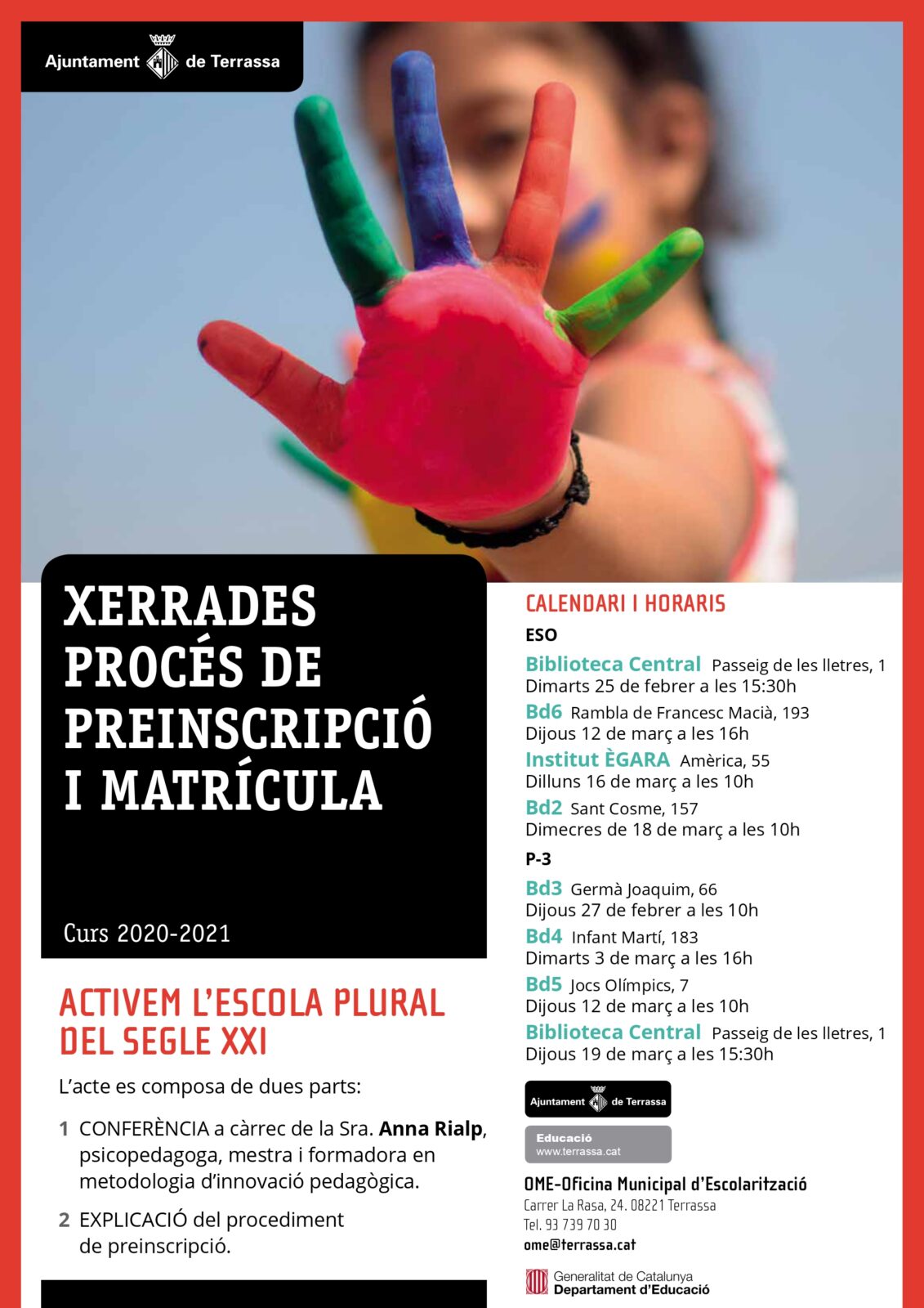 La jornada de portes obertes ha estat cancel·lada pel tancament de tots els centres educatius a partir del dia 13 de març per evitar la propagació del coronavirus. El proper dijous dia 19 de març de 15 a 17.30 h. tindrà lloc la jornada de portes obertes per tal que les famílies interessades pugueu conèixer […]