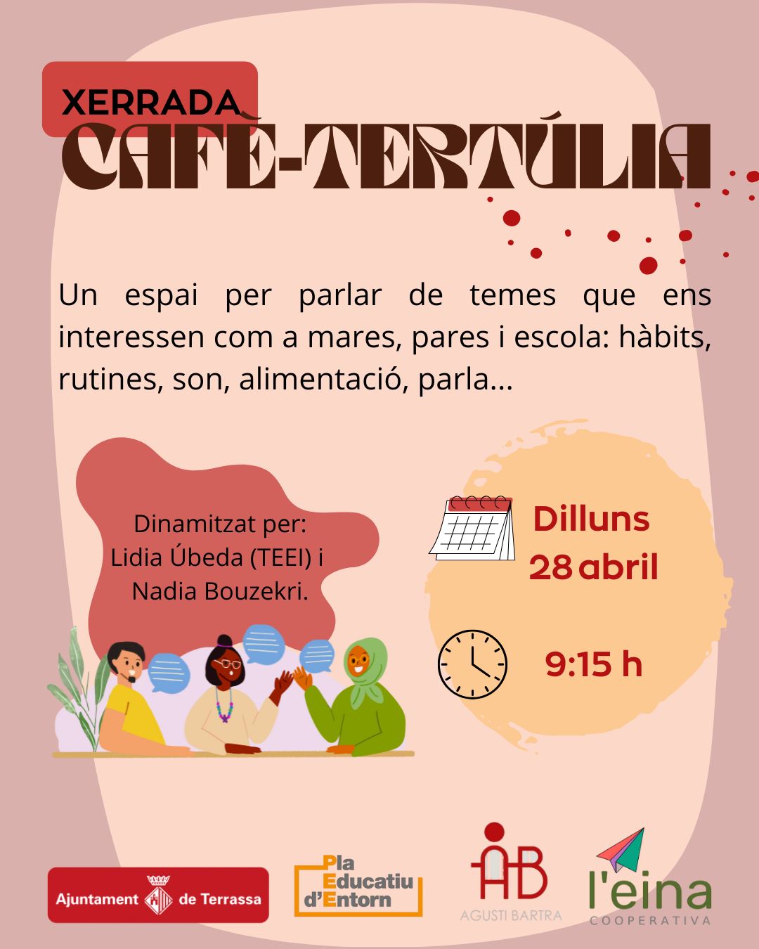 Famílies, el proper dilluns 28 d’abril tindreu l’oportunitat de gaudir d’un cafè-tertúlia, un espai per xerrar i compartir sobre temes interessants com els hàbits, les rutines, l’alimentació, els límits o la parla entre d’altres. Començarà a les 9:15 h i finalitzarà a les 10:45 i estarà dinamitzat per la Lídia Úbeda, la TEEI de l’escola, i la […]