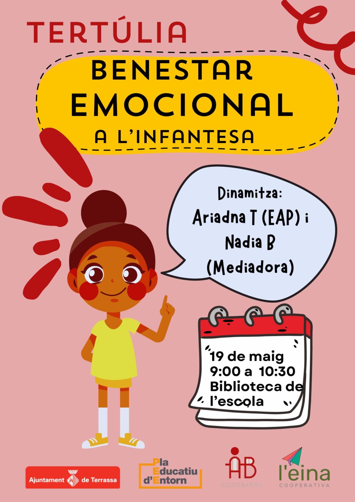 Famílies, us convidem el proper 19 de maig a l’escola per parlar de la salut mental d’una manera positiva i propera! Començarà a les 9:30 a la biblioteca de l’escola i finalitzarà a les 10:30h i estarà dinamitzarà per l’Ariadna, de l’EAP i la Nadia, la mediadora. Us esperem!
