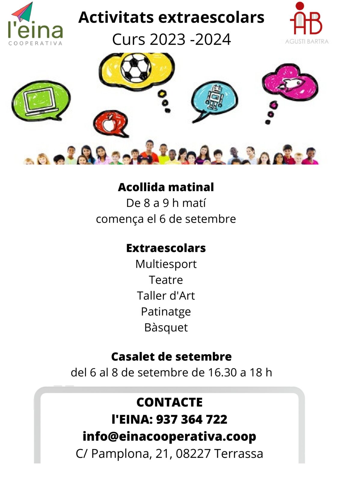 L’escola Agustí Bartra us desitja que passeu un bon estiu. L’escola estarà oberta a partir del divendres dia 1 de setembre. Us recordem que el curs 2023-2024 començarà per a l’alumnat el dimecres dia 6 de setembre en horari de 9 a 12.30 i de 3 a 4.30.