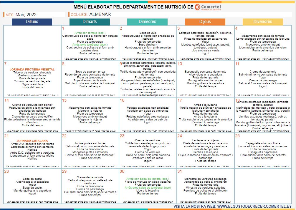 Les persones interessades poden consultar aquest menú a https://www.elgustodecrecer.es/ o sol·licitar el menú desitjat a la secretaria del centre.