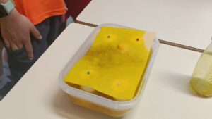 Ràpidament tot el recipient d’aigua es tenyeix de color taronja. La contaminació, en aquest cas és molt major, dons aquestes substàncies, al quedar diluïdes a l’aigua, no poden ser filtrades. La Sandra ens explica que la contaminació per nitrats és una de les més perjudicials per la salut de les persones i els animals.