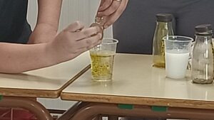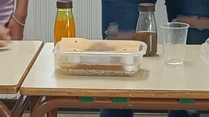Després hi tirem aigua bruta (agua que hem barrejat amb sabó de rentar mans). Observem que part del residu sòlid s’ha quedat a la superfície i, després de ser filtrada pel sòl, només està tèrbola. Però, alerta, no està pas neta!!! Ja s’ha contaminat i no seria apta pel consum.