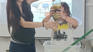 Després hi tirem aigua bruta (agua que hem barrejat amb sabó de rentar mans). Observem que part del residu sòlid s’ha quedat a la superfície i, després de ser filtrada pel sòl, només està tèrbola. Però, alerta, no està pas neta!!! Ja s’ha contaminat i no seria apta pel consum.