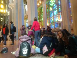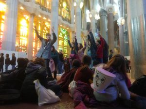 Després varen poder veure com era la façana nova del temple i van conèixer el significat de tots els símbols importants d’aquesta part de la Sagrada Família. Un cop a dins, van experimentar l’efecte de colors que provoca el sol en els vitralls i què representen les diferents columnes (són arbres, a la foto dels nens amb els braços estirats s’està representant aquestes columnes).