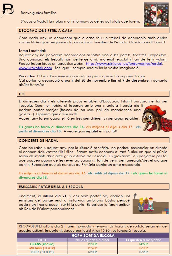 Benvolgudes famílies, S’acosta Nadal! Adjuntem comunicat informatiu amb les activitats que farem a l’escola. Poseu especial atenció a les activitats que afecten als vostres fills/es segons el Cicle al que estiguin assignats/des. RECORDEU: Petits : P3, P4, P5 Mitjans: 1r, 2n, 3r Grans: 4t, 5è, 6è Comissió de festes