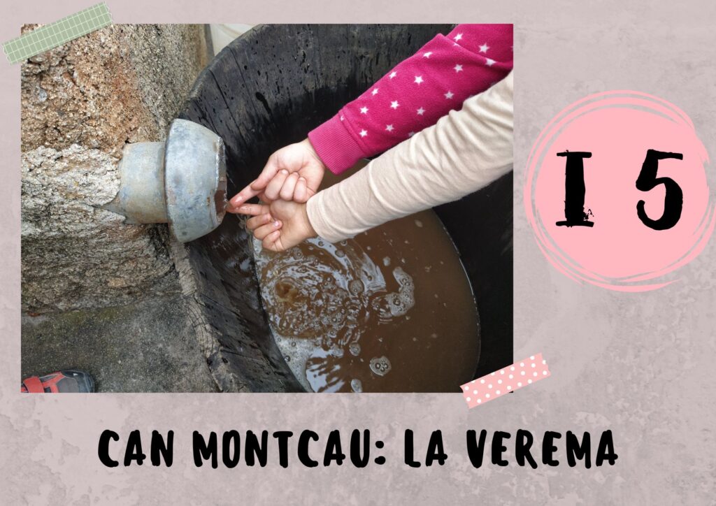 Hem començat anant a la vinya per veure els ceps i els tipus de raïm. També hem viscut la sensació de trepitjar i premsar el raïm per fer el most, que més endavant, després de la fermentació, es convertirà en vi.