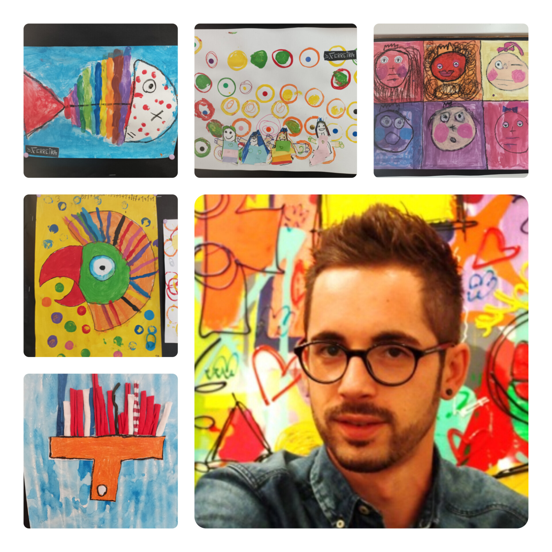 Aquest trimestre hem començat a treballar el pintor David Ferreira als tallers d’art. És un artista contemporani d’origen francès, i la seva obra es pot reconèixer per la barreja entre geometria, color i una energia lúdica molt personal. La seva pintura celebra la infància i el joc, amb composicions on conviuen símbols matemàtics, traços espontanis i alguns elements recurrents com els seu personatge “Toto”.