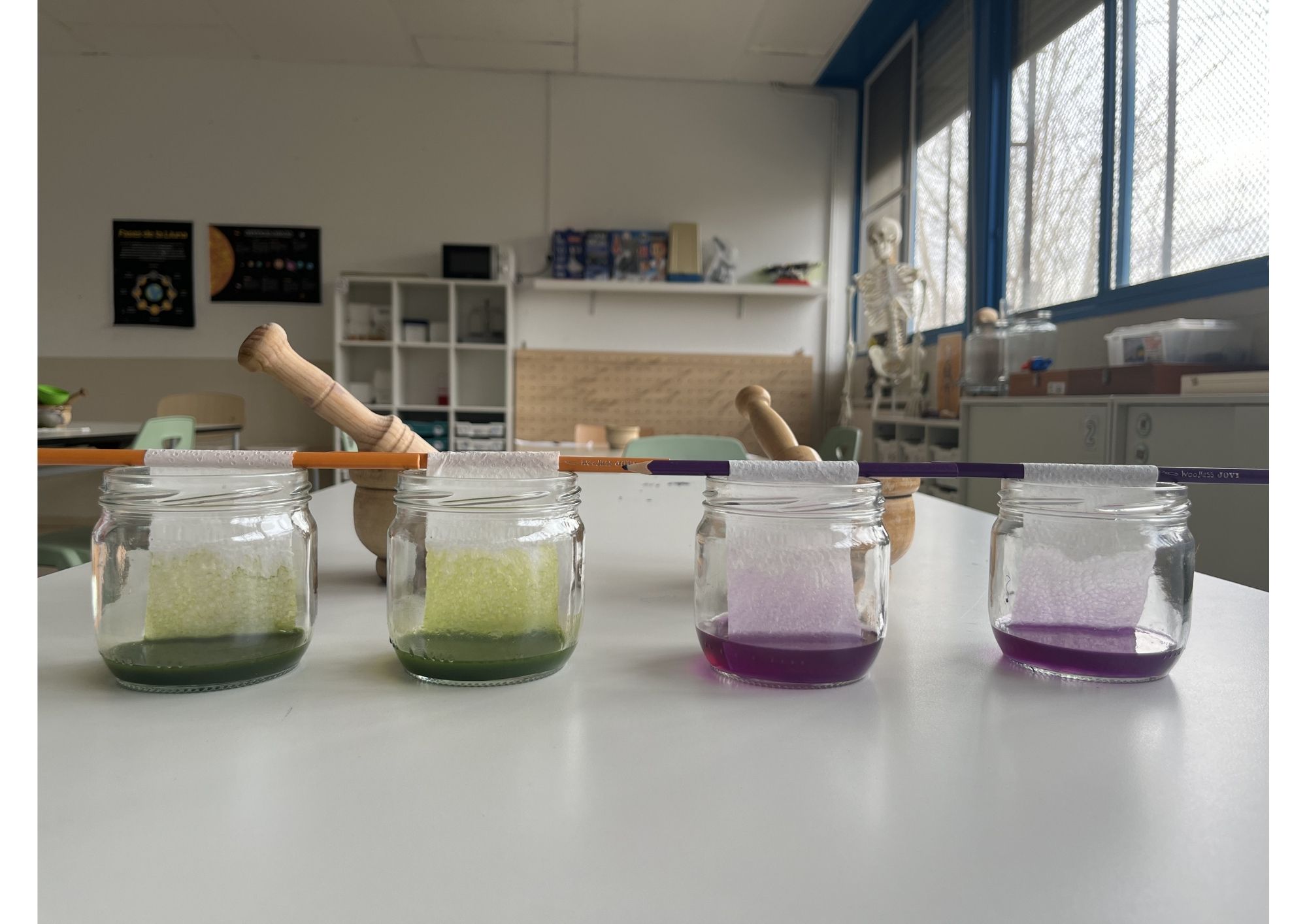 A poc a poc, el líquid va anar pujant pel paper i va arrossegar els pigments de les plantes. Aquest procés va permetre separar els diferents colors que formen part de les fulles. Tothom va poder observar bandes de diversos tons verds, grocs i fins i tot violetes.
