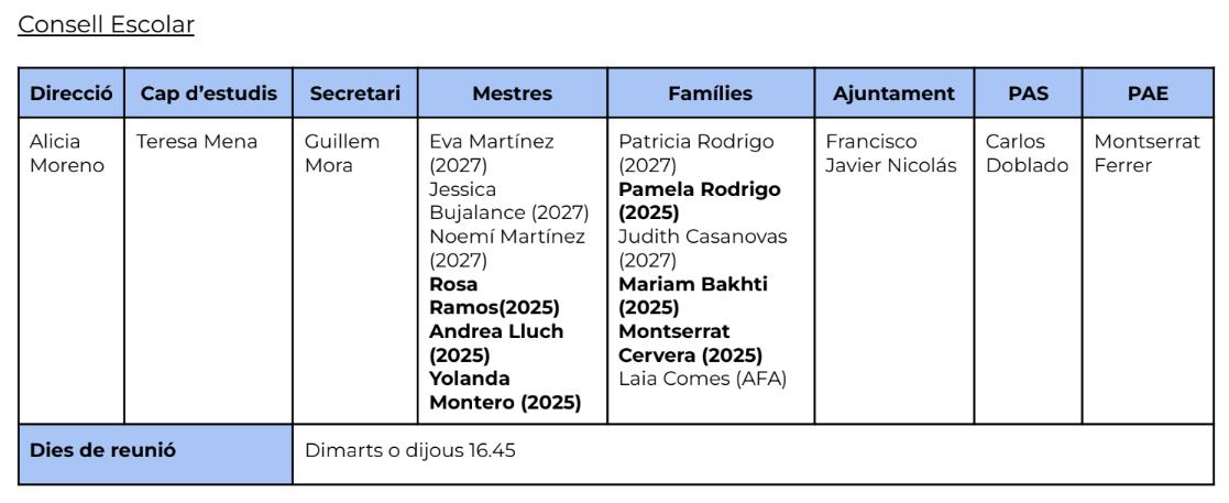 Consell Escolar A continuació podeu veure la composició actual del Consell Escolar i quines són les seves funcions: