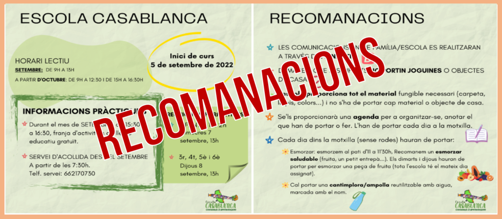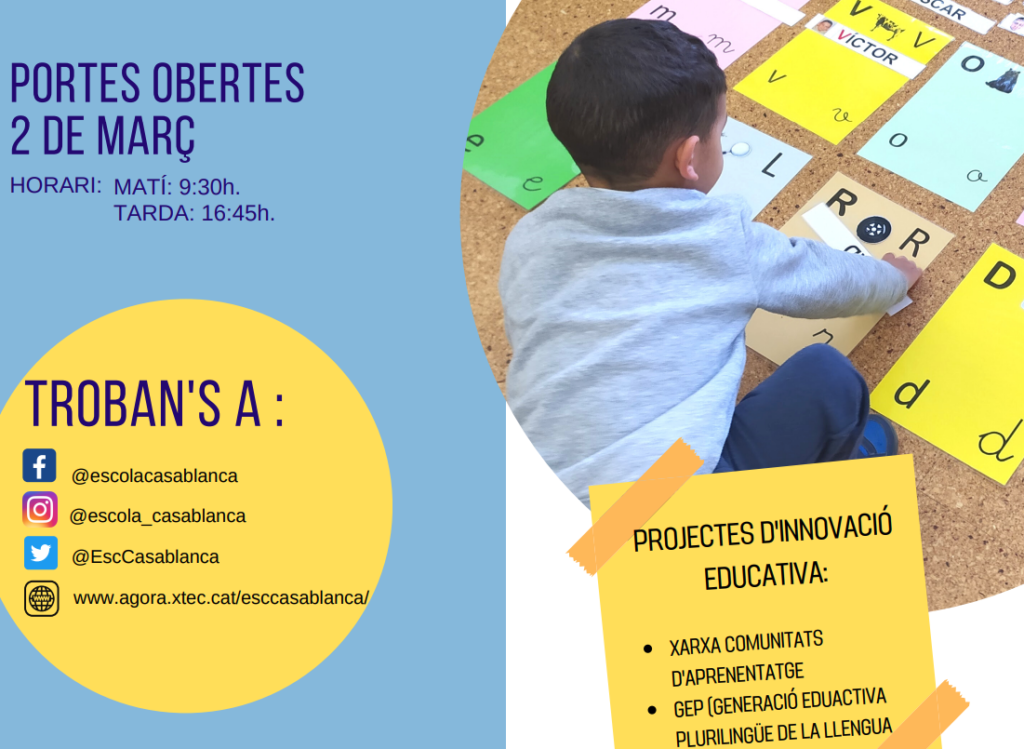 Hem preparat una presentació sobre com funciona l’escola Casablanca que vam fer servir a les portes obertes el passat 2 de març. Si no vau poder venir aquí us ho deixem, davant de qualsevol consulta no dubteu en escriure un correu electrònic al a8025587@xtec.cat o trucar al telèfon 93 640 29 15.