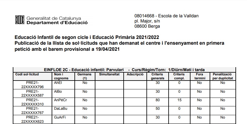 Benvolgudes famílies, Us deixem la publicació de la llista de sol·licituds que han demanat al centre i l’ensenyament en primera petició amb el barem provisional a 19/04/2021. Publicació llista