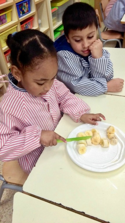 En primer lloc, a l’espai de conversa hem observat i manipulat les fruites (plàtans, maduixes, peres, pomes). Hem observat les propietats físiques de cada fruita. Seguidament, hem tallat la fruita a bocinets. Quants trossos surten, molts, pocs? A continuació, els hem llançat la pregunta: Quants pals necessitarem per fer una broqueta? Entre totes i tots hem arribat a la solució i amb l’ajuda de la mestra hem intentat fer una sèrie de dos elements, passant els trossets de fruita per dins del pal. Finalment, hem observat el resultat i ens hem menjat les broquetes! Que bones estaven!