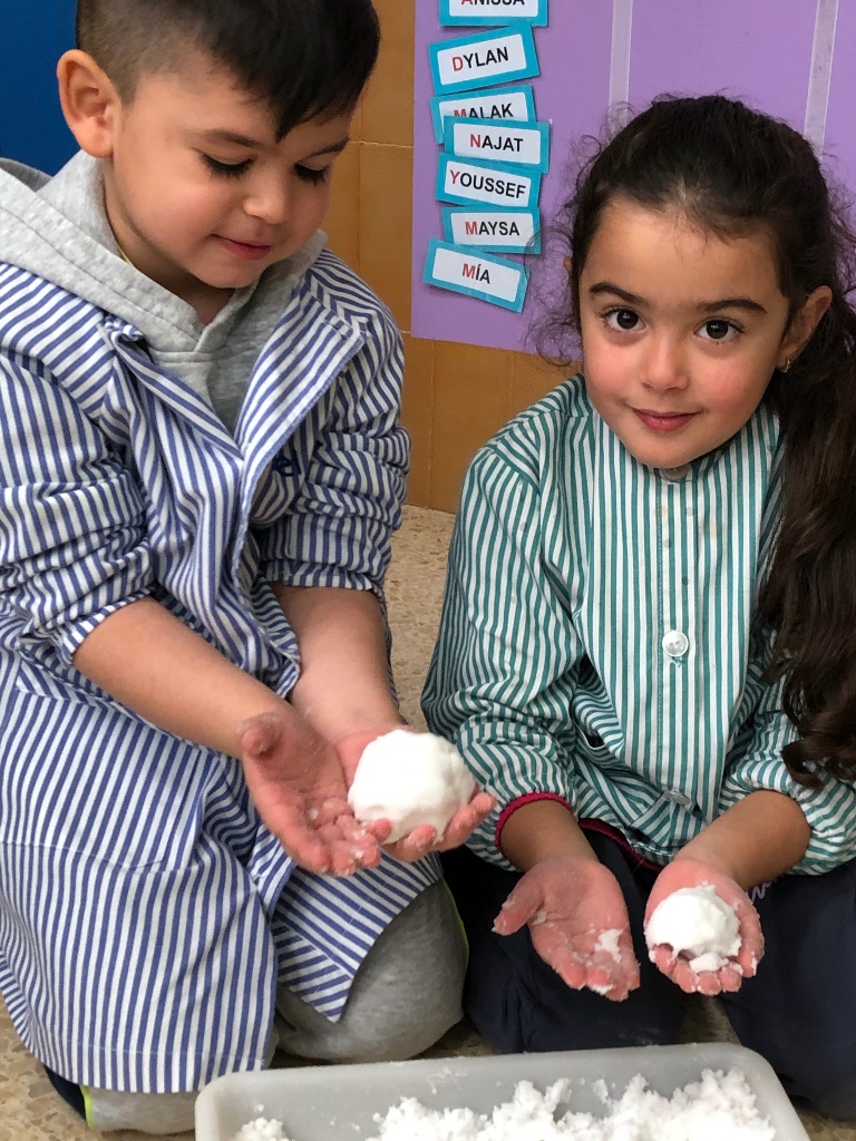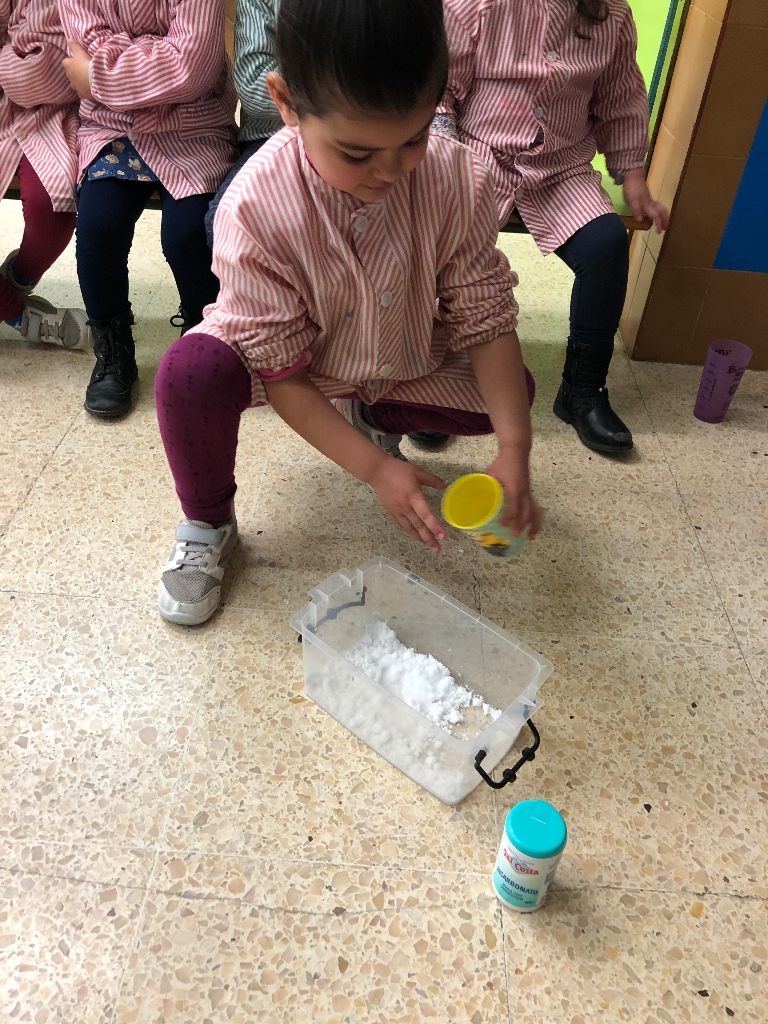 Els nens i les nenes de P4 hem fet neu! Els ingredients són: aigua freda i bicarbonat. Al matí vam posar una guerra d’aigua a la nevera perquè es refredés i a la tarda vam fer l’experiment. Primer vam posar bicarbonat, després vam afegir aigua a poc a poc i finalment vam barrejar-ho tot fins que vam fer màgia. Teníem neu a la classe! Va ser molt divertit! Ens va agradar molt tocar la neu, estava freda. Vam fer boletes de neu i ninots de neu!