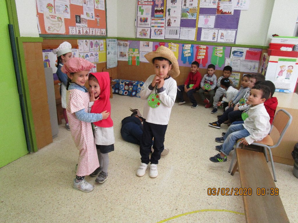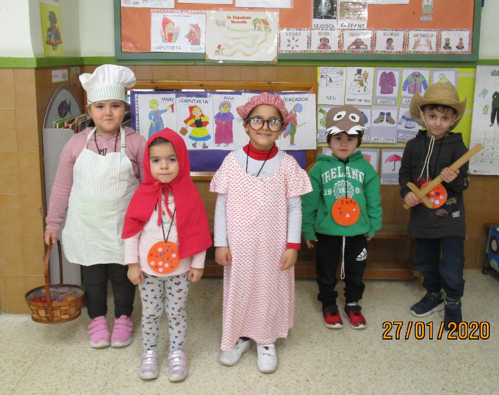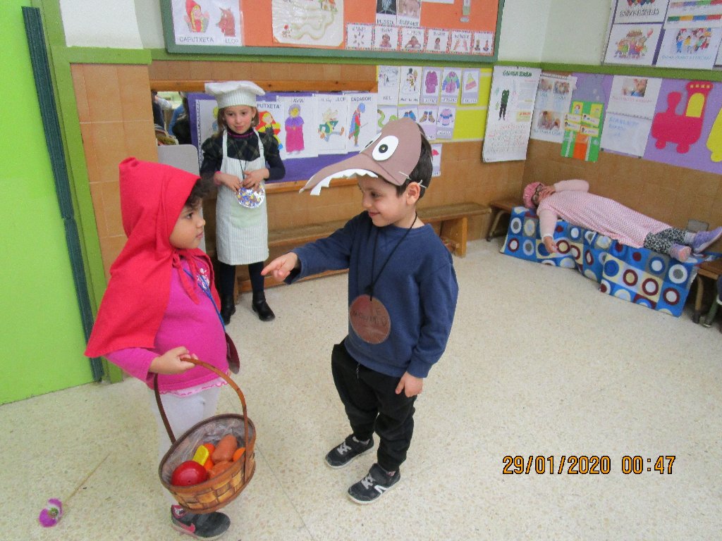 Un dels contes que he explicat en format paper i amb suport visual de làmines dels personatges, és el conte de LA CAPUTXETA VERMELLA. Un cop els hi he explicat, els hi dic: Ara me l’expliqueu vosaltres! I pregunto qui vol representar a cada personatge. I cada infant es posa la disfressa que caracteritza a cada personatge. Primer representa el conte un grup d’alumnes i l’altre grup escolta i després a l’inrevés.